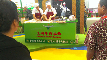 圖為各級領(lǐng)導(dǎo)、觀眾及參展商圍觀公司拉面師傅現(xiàn)場表演蘭州牛肉拉面