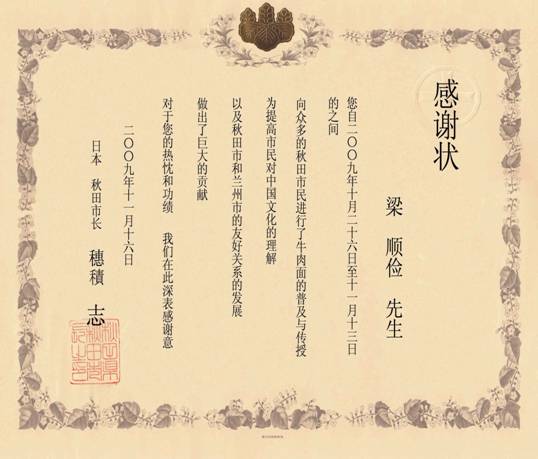 日本秋田市贈予金味餐飲有限公司總經(jīng)理、蘭州市烹飪技術(shù)協(xié)會副會長梁順儉先生的感謝狀