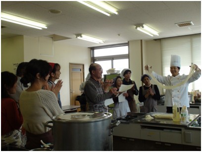 甘肅金味餐飲有限公司總經(jīng)理、蘭州市烹飪技術(shù)協(xié)會(huì)副會(huì)長(zhǎng)梁順儉先生向日本秋田市民傳授蘭州拉面文化。