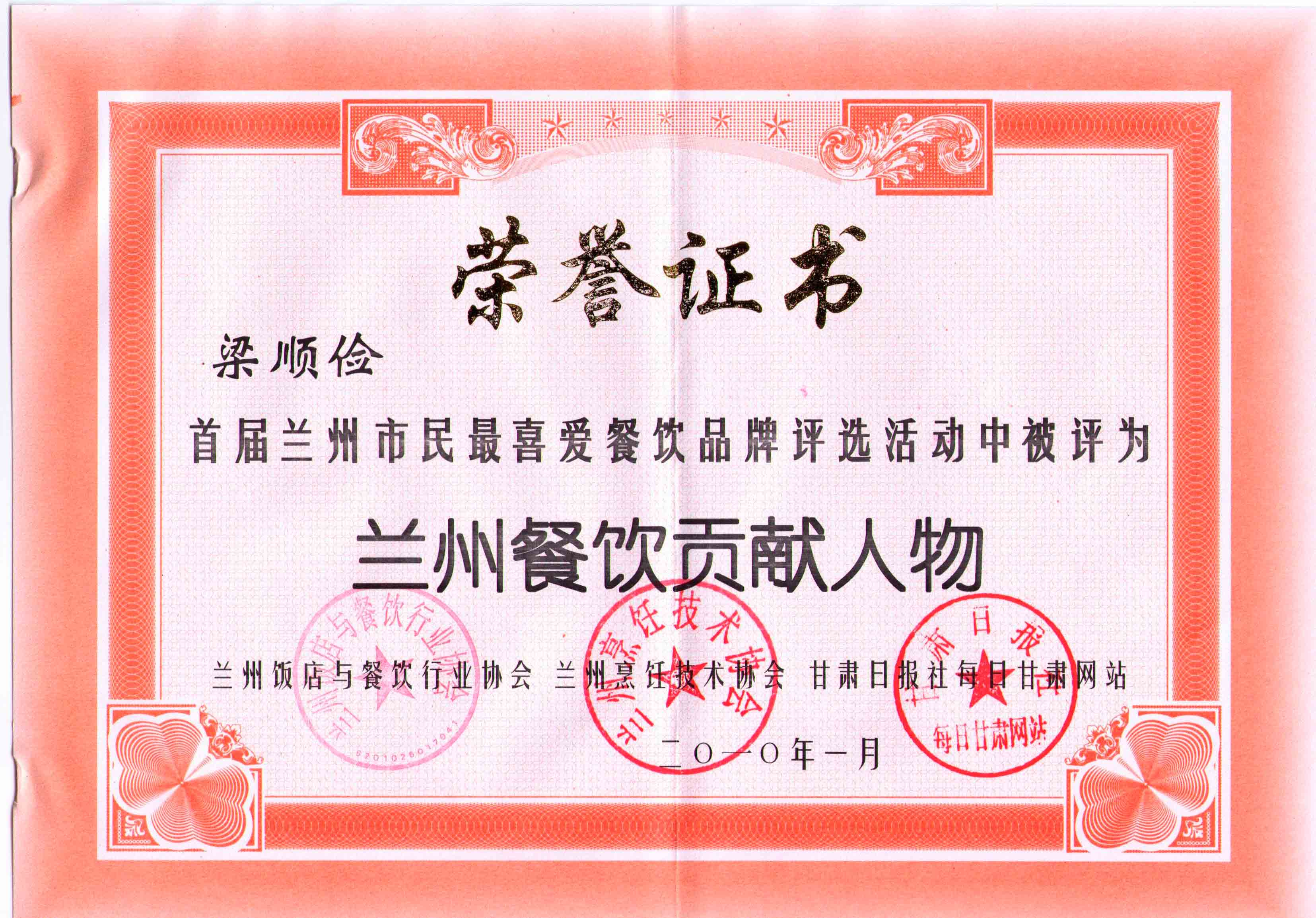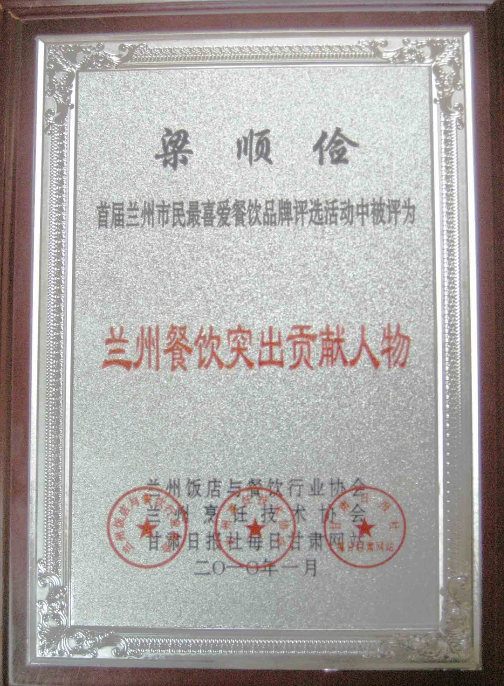 2010年1月28日,由蘭州飯店與餐飲行業(yè)協(xié)會(huì)、蘭州烹飪技術(shù)協(xié)會(huì)、甘肅日?qǐng)?bào)社每日甘肅網(wǎng)聯(lián)合主辦的“首屆蘭州市民最喜愛餐飲品牌”評(píng)選系列活動(dòng)圓滿落下帷幕。甘肅金味餐飲有限公司總經(jīng)理梁順儉被評(píng)為了蘭州餐飲貢獻(xiàn)人物。對(duì)于梁順儉先生來說,這個(gè)獎(jiǎng)項(xiàng)不同于以往的獎(jiǎng)項(xiàng),這是蘭州市民對(duì)梁順儉先生這些年來為了發(fā)揚(yáng)蘭州傳統(tǒng)特色美食牛肉拉面所付出努力的最大肯定。梁順儉先生說,這是他二十多年廚藝生涯中最具有特殊意義的一個(gè)獎(jiǎng)項(xiàng),這個(gè)獎(jiǎng)是廣大蘭州市民頒發(fā)給他的,有了廣大市民的支持,他會(huì)更有動(dòng)力,更有激情投身于弘揚(yáng)蘭州牛肉拉面的事業(yè)上,讓蘭州牛肉拉面香飄世界。
