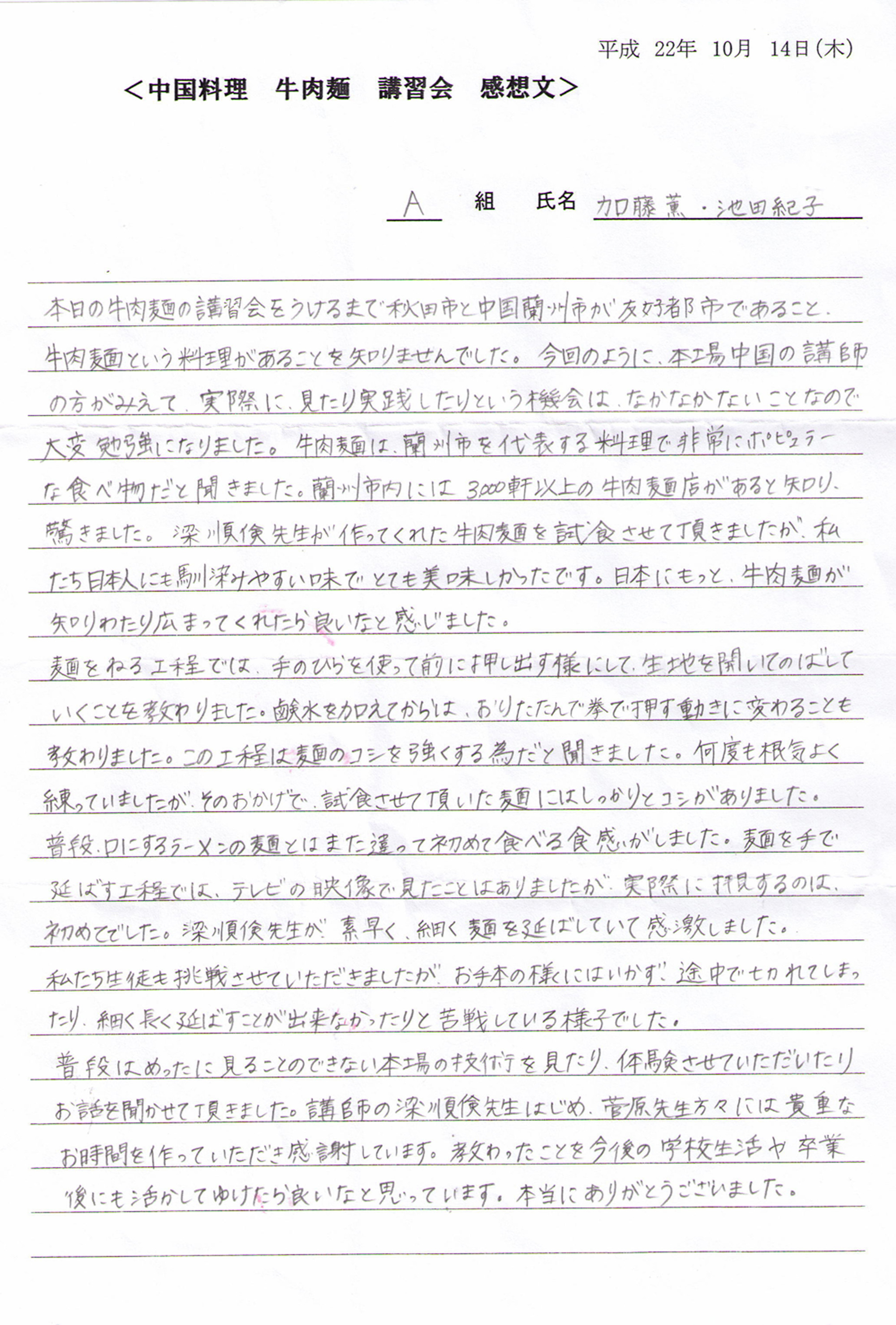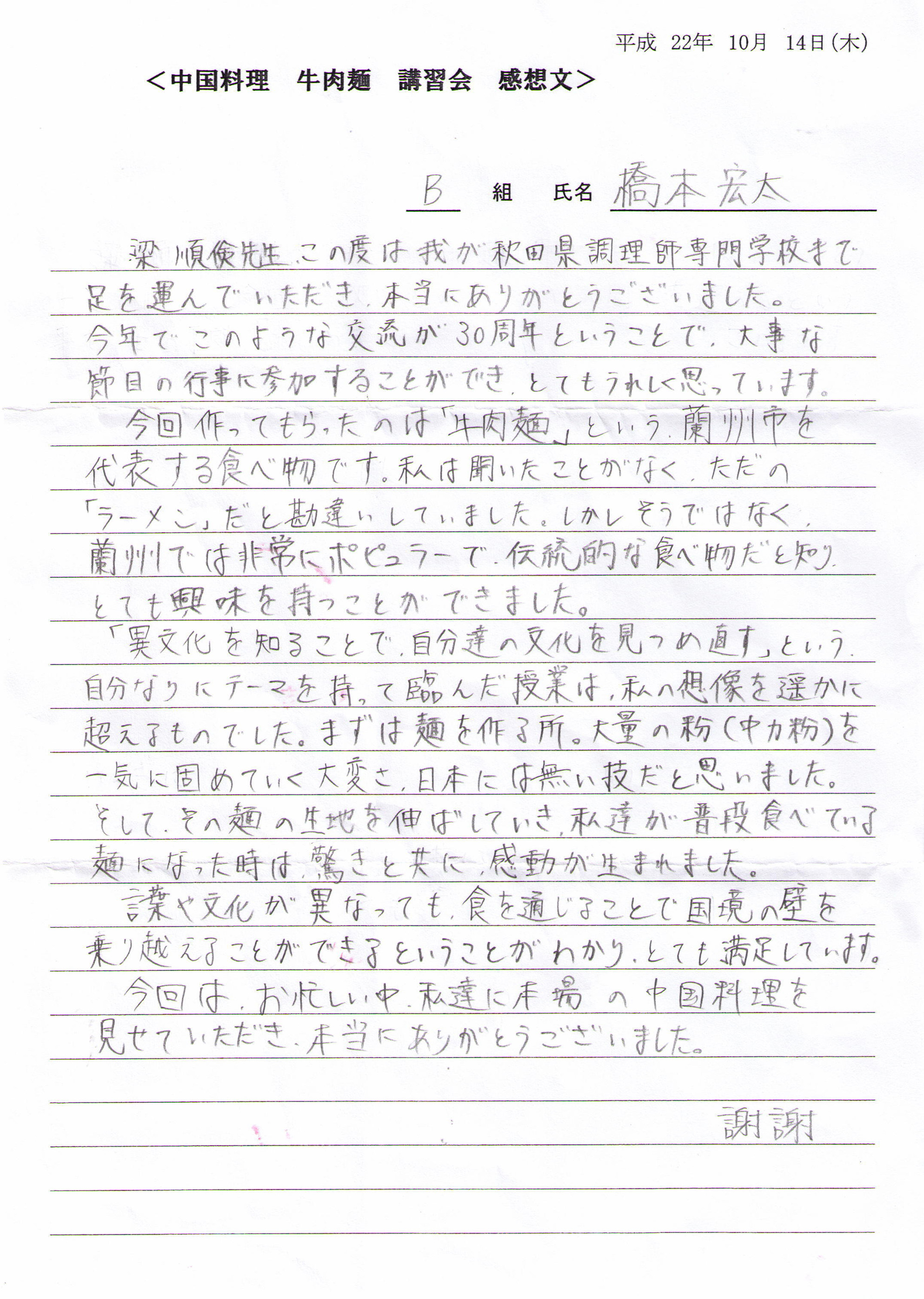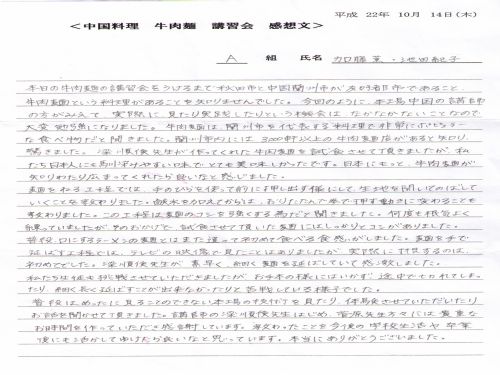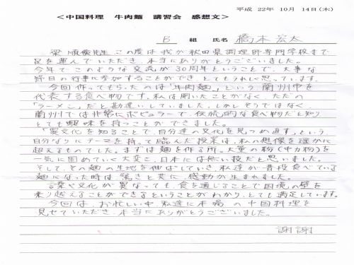 梁順儉先生在2010年赴日本秋田做蘭州牛肉拉面文化技術(shù)交流期間,應(yīng)邀到日本秋田料理學(xué)校向?qū)W生們講解了蘭州牛肉拉面文化及蘭州牛肉拉面特點(diǎn)、并向?qū)W生們進(jìn)行了蘭州拉面技術(shù)表演及制作蘭州牛肉拉面,學(xué)生們對此表示非常的感謝,并專門致感謝信。