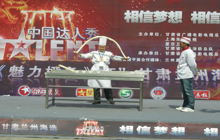 在9月29日《中國達(dá)人秀》蘭州第二場海選賽中,甘肅金味餐飲有限公司張興富師傅以牛肉拉面穿針的精彩表演絕對勝出!