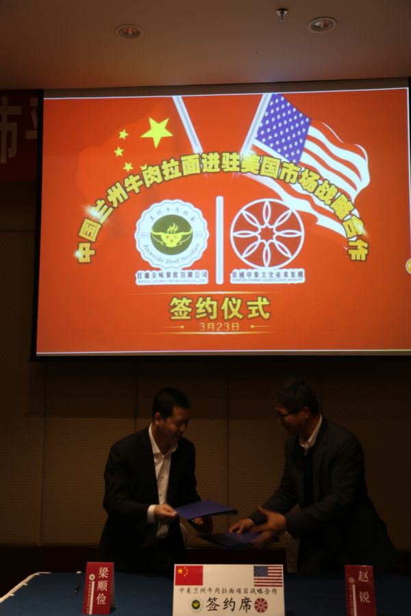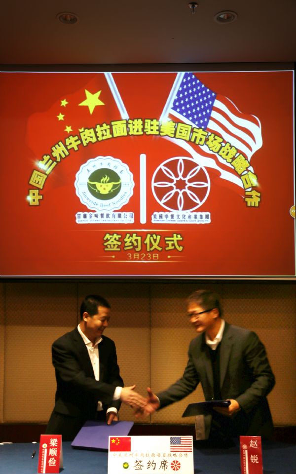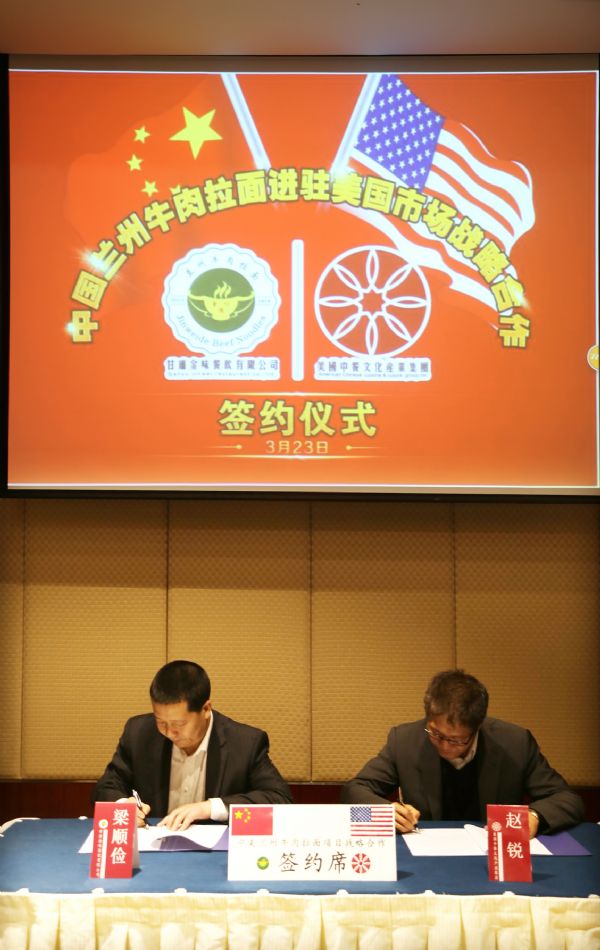 帶動(dòng)中國(guó)蘭州牛肉拉面走出國(guó)門(mén),走向世界,實(shí)現(xiàn)中美兩國(guó)餐飲企業(yè)跨越式發(fā)展在金城蘭州舉行了隆重的“中國(guó)蘭州牛肉拉面進(jìn)駐美國(guó)市場(chǎng)戰(zhàn)略合同”簽約儀式。