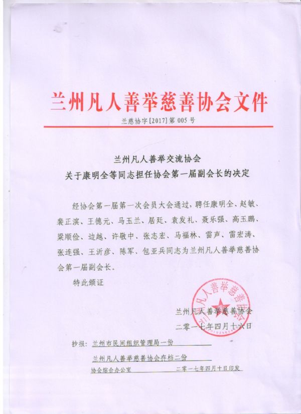 此次會議上,經(jīng)協(xié)會第一屆第一次會員大會通過,聘任康明全、趙敏、梁順儉等20名同志為蘭州凡人善舉慈善協(xié)會第一屆副會長。