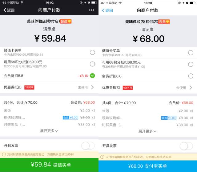 秒付打通了西貝的會(huì)員及收銀系統(tǒng),付款時(shí)即可成為會(huì)員,還可以判定顧客是否到店消費(fèi)過(guò),可自動(dòng)匹配會(huì)員、折扣等級(jí),核銷(xiāo)會(huì)員積分、優(yōu)惠券。顧客在結(jié)算時(shí)可自行選擇想使用的優(yōu)惠類(lèi)型,并一鍵買(mǎi)單,同時(shí)還可輸入發(fā)票信息實(shí)現(xiàn)遠(yuǎn)程開(kāi)發(fā)票。