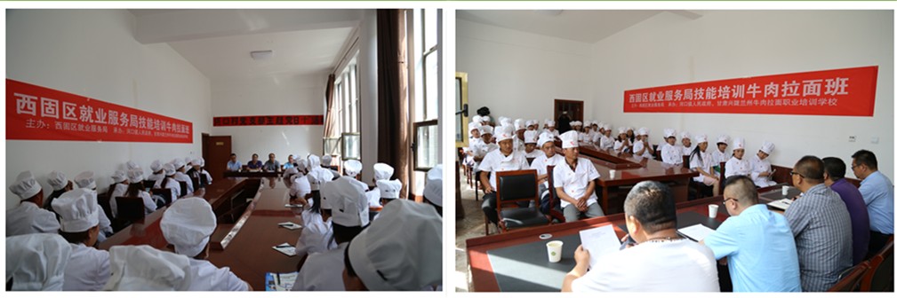 西固區(qū)就業(yè)服務(wù)局局長王海龍、河口鎮(zhèn)政府黨委書記黃建國、副書記楊世鵬、西固區(qū)就業(yè)服務(wù)局培訓(xùn)科主任薜會斌、甘肅興隴蘭州牛肉拉面職業(yè)培訓(xùn)學(xué)校副校長張桂梅以及河口鎮(zhèn)河口村經(jīng)營戶和富余勞動力等60多人參加了此次開班儀式。