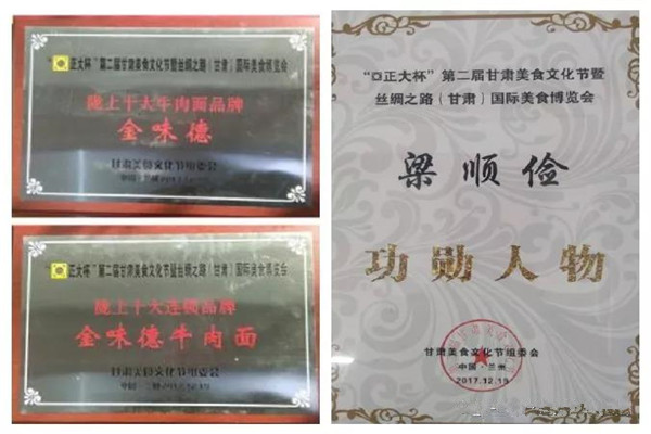 “正大杯”第二屆甘肅美食文化節(jié)暨絲綢之路(甘肅)國際美食博覽會上,金味蘭州牛肉拉面斬獲隴上十大牛肉拉面品牌、隴上十大連鎖品牌兩項大獎,金味德集團董事長梁順儉被授予“甘肅餐飲業(yè)十大功勛人物”榮譽稱號。