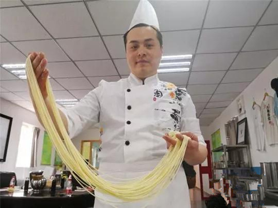 西班牙的華人Terry Wu經(jīng)過(guò)學(xué)習(xí)已經(jīng)能拉出10余種面型。圖為Terry Wu展示拉面技藝。
