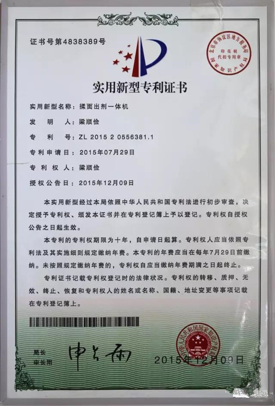 揉面出劑一體機(jī)專利證書(shū)
