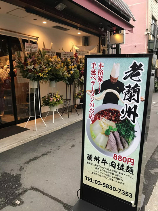 在日本的東京,約在兩年前開始出現(xiàn)了兩家經(jīng)營蘭州牛肉拉面的店鋪,但這兩家店鋪的經(jīng)營者并非地道的蘭州人,這使土生土長(zhǎng)的在日本生活的甘肅同鄉(xiāng)會(huì)的會(huì)員們感到了不小的慚愧與壓力,在甘肅同鄉(xiāng)會(huì)名譽(yù)會(huì)長(zhǎng)王昕的唱導(dǎo)下,會(huì)員們一致贊成,在東京開一家蘭州人自己經(jīng)營的蘭州牛肉面店,此想法得到了甘肅省僑聯(lián)領(lǐng)導(dǎo)及蘭州牛肉面聯(lián)合會(huì)的大力支持,同鄉(xiāng)會(huì)會(huì)員多次返回蘭州取經(jīng)問寶,經(jīng)過一年間的緊張籌備,9月2日首家由蘭州人自己經(jīng)營的蘭州牛肉拉面店終于在東京淺草成功開張!