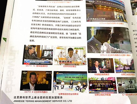 “金味德牦牛肉拉面”品牌以全新的拉面經(jīng)營模式、、在甘肅、蘭州引起電視、報(bào)紙、網(wǎng)絡(luò)等媒體及行業(yè)的極大關(guān)注,并在短時(shí)間內(nèi)得到牛肉拉面故鄉(xiāng)——蘭州的廣大顧客的認(rèn)可和追捧!敖鹞兜隆迸H饫鎸S脺显谌珖呐渌秃蛷V泛使用,《蘭州牛肉拉面寶典》的全國發(fā)行,興隴蘭州牛肉面職業(yè)培訓(xùn)學(xué)校每年面向全國各地及國外培訓(xùn)大批的蘭州拉面師,都是其它品牌無法復(fù)制的宣傳渠道,使“金味德”品牌在海內(nèi)外得到了廣泛的宣傳,非常有利于加盟企業(yè)的發(fā)展。