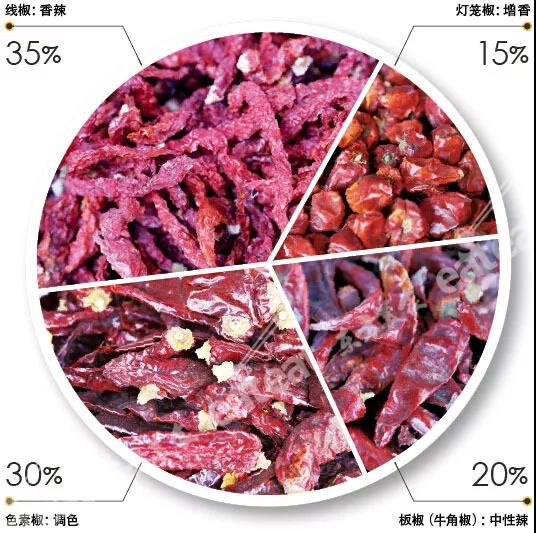 以北京地區(qū)的大部分食客口味為例子,線椒占35%,色素椒占30%,燈籠椒占15%,板椒占20%。