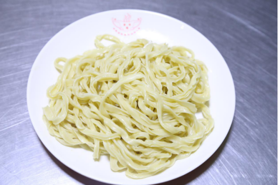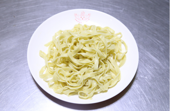 2、韭葉扁形面條,韭菜葉的形狀,寬約4~5mm,一般六手成型。溫潤透明,纖薄而不粘連?诟芯鼷,為喜愛扁形面條的食客所喜愛。