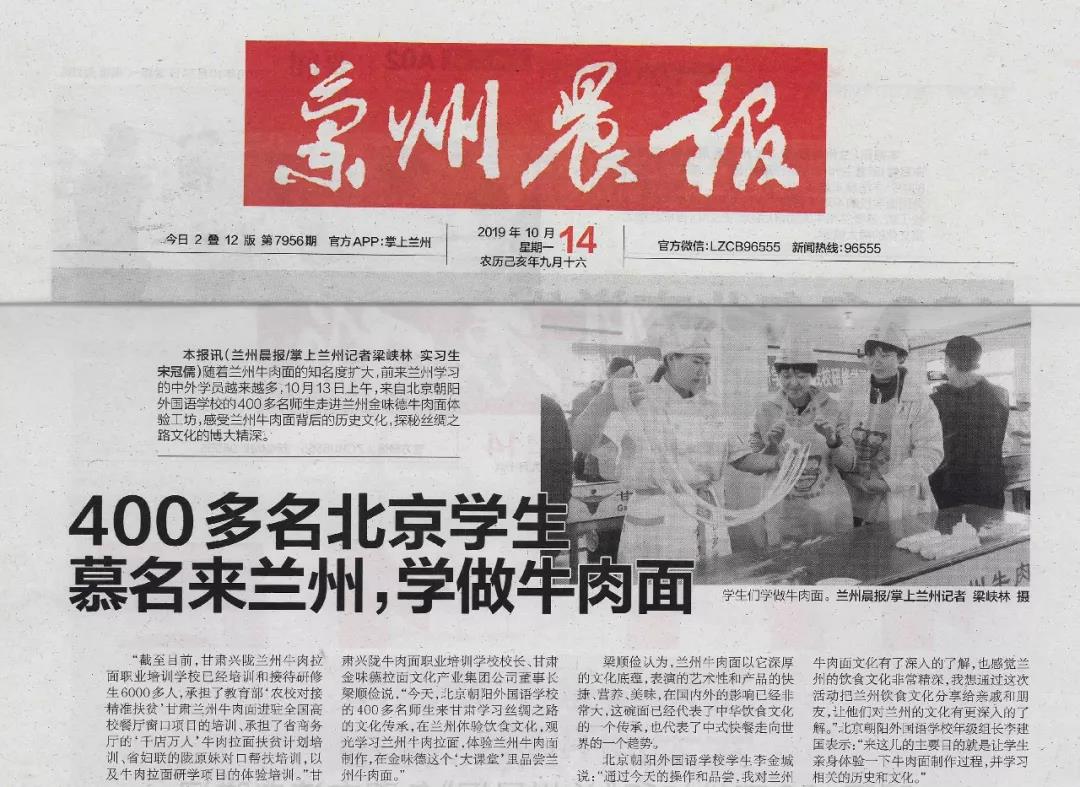 蘭州牛肉拉面享譽世界,10月12-13日兩天,來自北京朝陽外國語學校的400多名師生走進蘭州金味德,感受蘭州牛肉面背后的歷史文化,探秘絲綢之路博大精深。獲得多家媒體爭相報道。