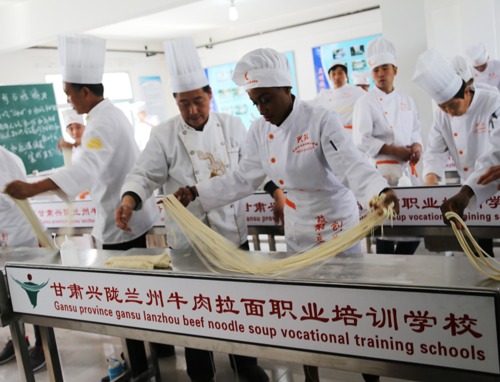 2018年4月11日,來自哈薩克斯坦、澳大利亞等國學(xué)員在甘肅興隴蘭州牛肉拉面職業(yè)培訓(xùn)學(xué)校學(xué)習(xí)牛肉面制作工藝。
