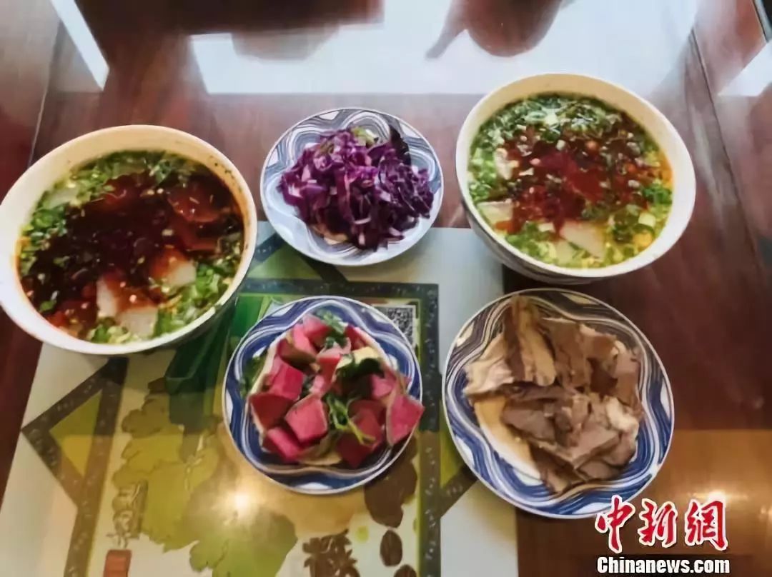 圖為蘭州牛肉面”套餐”,一清二白三紅四綠五香。