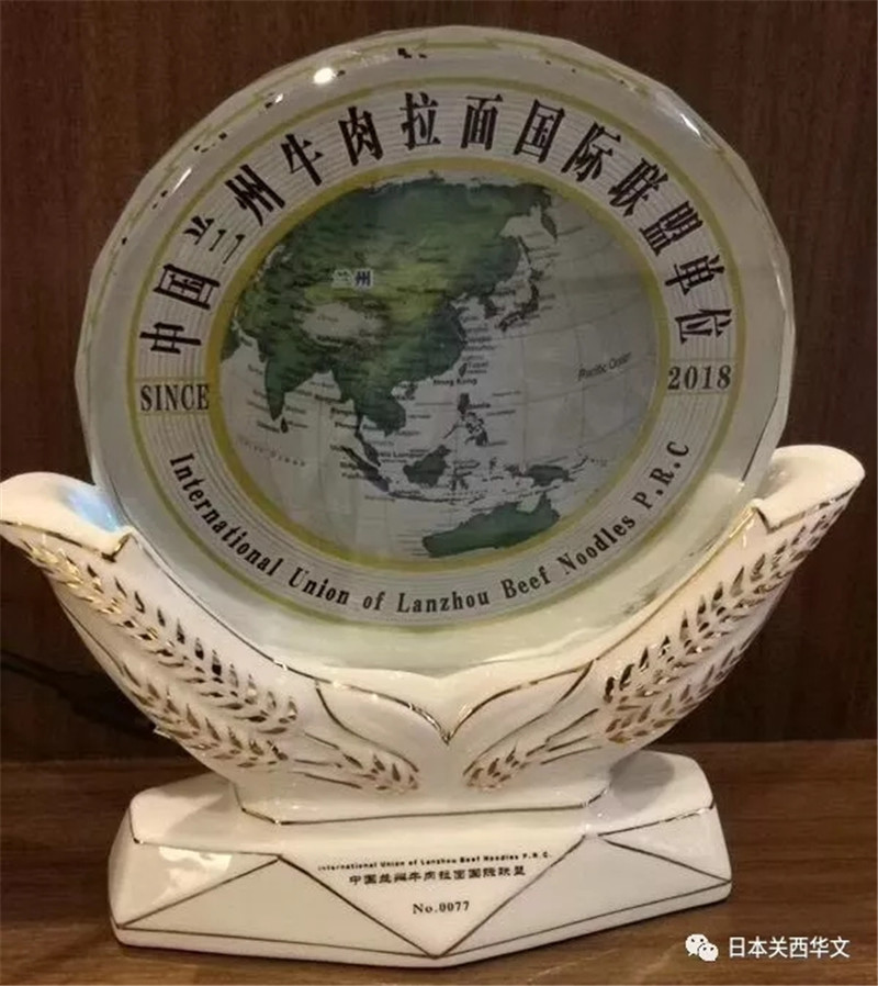 蘭州牛肉拉面國(guó)際聯(lián)盟主席梁順儉向康主恩社長(zhǎng)授牌