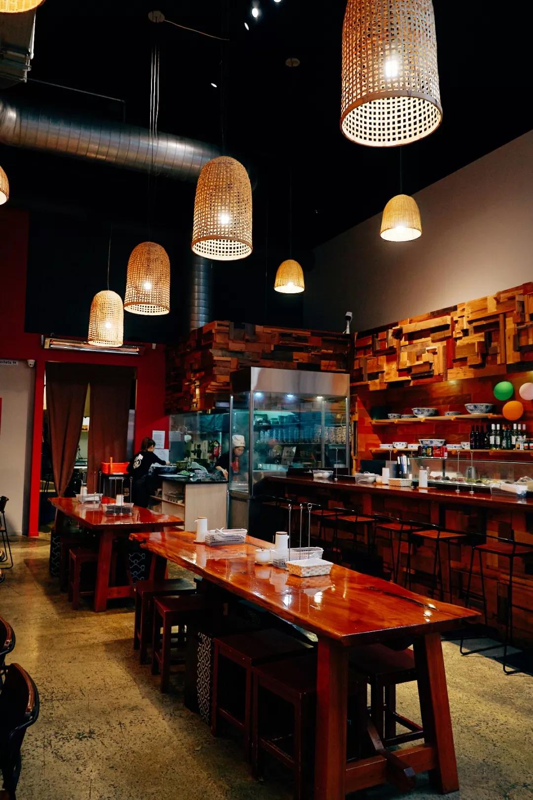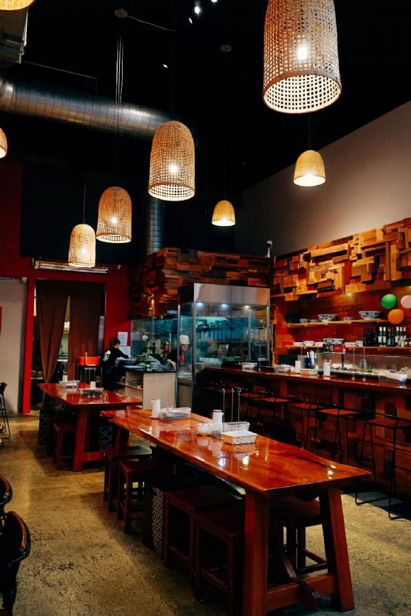 進(jìn)到店里,傳統(tǒng)與現(xiàn)代相結(jié)合的裝潢風(fēng)格令人賞心悅目。木質(zhì)桌椅、皮革沙發(fā),簡(jiǎn)潔大氣;竹制燈籠營(yíng)造出搖曳曼妙的氛圍;巨幅海報(bào)詮釋著拉面之道。