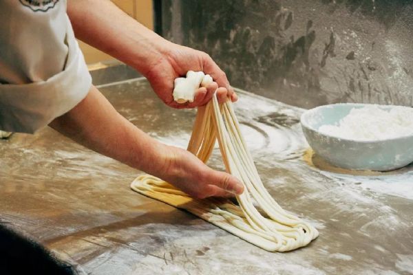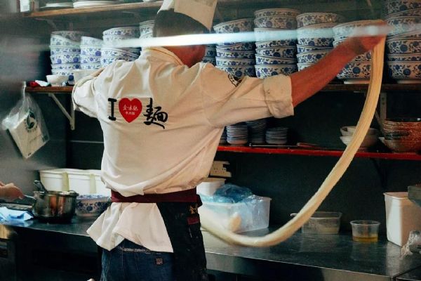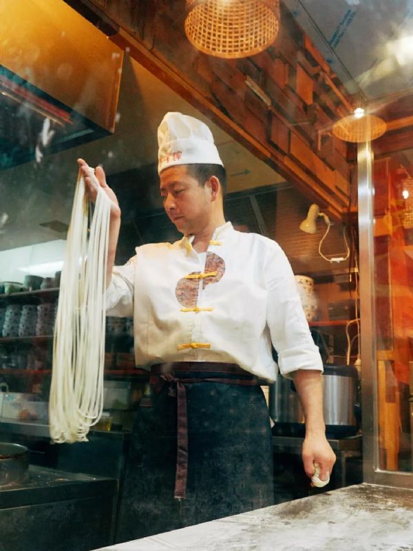 金味德的拉面師傅宛如一位身懷絕技的武林高手,站在開(kāi)放廚房后面,一塊面團(tuán)經(jīng)過(guò)搗、揉、抻、拉、摔、摜等手法,只消片刻功夫,變得柔韌綿長(zhǎng)、粗細(xì)均勻,讓人嘖嘖稱贊!