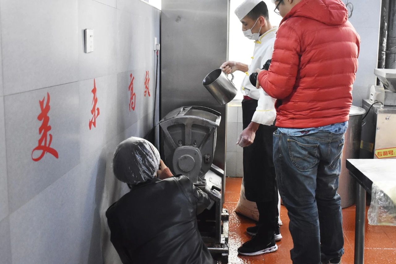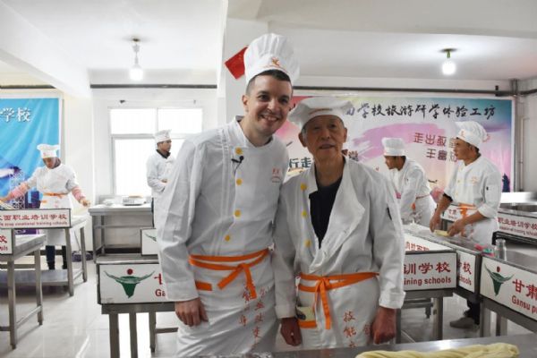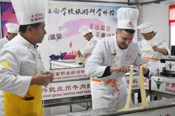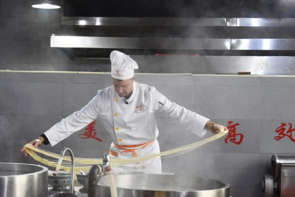 當(dāng)日上午,司徒建國(guó)和團(tuán)隊(duì)首先來(lái)到金味德旗下的甘肅興隴蘭州牛肉拉面職業(yè)培訓(xùn)學(xué)校。他穿上廚師服,戴上廚師帽,走進(jìn)培訓(xùn)室學(xué)拉面。學(xué)校的周老師一邊給他講解拉面技術(shù),一邊進(jìn)行拉面展示。司徒建國(guó)認(rèn)真地看著,英俊的臉上充滿了驚奇。只見(jiàn)他細(xì)長(zhǎng)的胳膊握著溜好的面條,慢慢地向兩端抻拉,面條變長(zhǎng),兩頭對(duì)折時(shí),發(fā)生“意外”。司徒建國(guó)不知道放到左手的什么位置,頓時(shí)慌了神。經(jīng)過(guò)周老師不斷的指導(dǎo),他才勉強(qiáng)完成所有環(huán)節(jié),拉好的面顯得“與眾不同”。培訓(xùn)室里還有其他學(xué)員練習(xí)拉面,司徒建國(guó)和他們互動(dòng)。趙大爺是“大齡”學(xué)員,司徒建國(guó)用一口標(biāo)準(zhǔn)的普通話提問(wèn)趙大爺,“您哪里人?”“您為啥來(lái)學(xué)拉面?”趙大爺熱情地一一回答。攝制團(tuán)隊(duì)一絲不茍地拍下整個(gè)過(guò)程。下午,攝制團(tuán)隊(duì)又來(lái)到金味德蘭州牛肉拉面體驗(yàn)工坊拍攝。司徒建國(guó)時(shí)而品嘗牛肉面,時(shí)而講解牛肉面文化,忙得不亦樂(lè)乎。而后,他親自下廚做了一碗牛肉面。兩相對(duì)比,更體現(xiàn)出金味德牛肉面的專業(yè)、精湛、可口。經(jīng)過(guò)不斷的講解、多次的拍攝,司徒建國(guó)和他的團(tuán)隊(duì)終于完成了攝制任務(wù)。“蘭州牛肉面真好吃,蘭州牛肉面文化博大精深,我會(huì)好好宣傳蘭州牛肉面,讓更多人來(lái)品嘗,喜歡上蘭州牛肉面!彼就浇▏(guó)伸著大拇指堅(jiān)定地說(shuō)到。