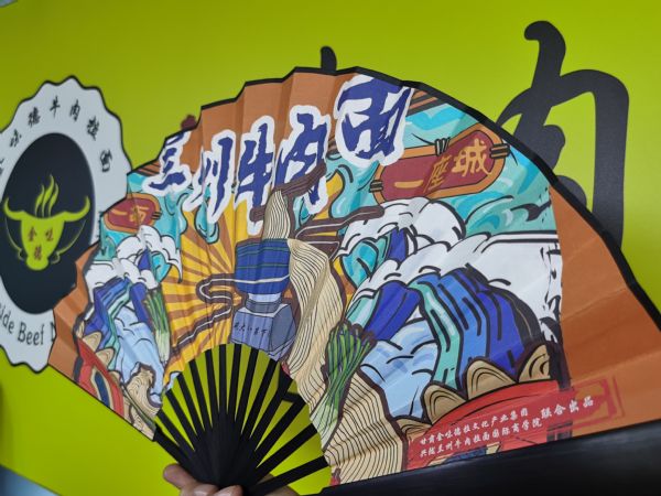 為推廣蘭州牛肉拉面,董事長梁順儉給馮鞏老師贈送了由甘肅金味德拉面文化產(chǎn)業(yè)集團和興隴蘭州拉面國際商學院聯(lián)合出品的蘭州拉面文創(chuàng)產(chǎn)品——扇子,馮鞏老師在蘭州登臺演時出時,手持的就是那一把扇子。