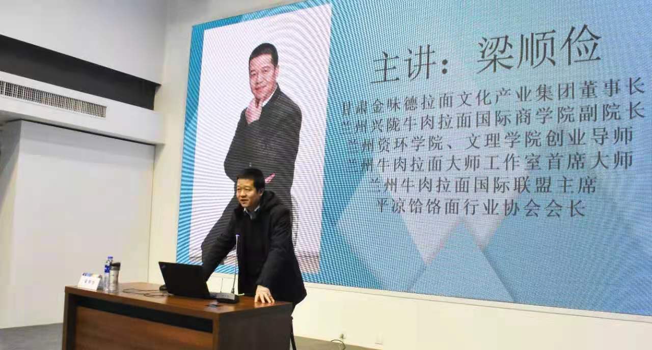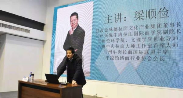 2020年12月16日,甘肅省第二屆文創(chuàng)人員創(chuàng)業(yè)訓(xùn)練營在蘭州文創(chuàng)產(chǎn)業(yè)園舉辦,特邀甘肅金味德拉面文化產(chǎn)業(yè)集團(tuán)董事長,省級(jí)蘭州牛肉拉面大師工作室首席大師、蘭州牛肉拉面國際聯(lián)盟主席、蘭州資源環(huán)境學(xué)院興隴牛肉拉面國際商學(xué)院副院長、甘肅興隴蘭州牛肉拉面職業(yè)培訓(xùn)學(xué)校校長梁順儉為“甘肅省第二屆文創(chuàng)人員創(chuàng)業(yè)訓(xùn)練營”學(xué)員進(jìn)行了非遺項(xiàng)目—蘭州牛肉拉面文化的國際化推廣及技藝傳承、創(chuàng)業(yè),文創(chuàng)產(chǎn)品開發(fā),產(chǎn)業(yè)化發(fā)展經(jīng)驗(yàn)進(jìn)行了分享。