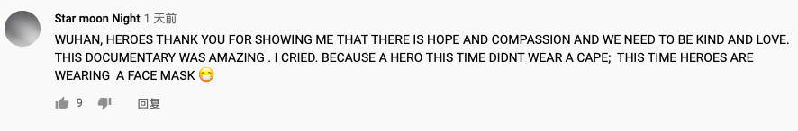海外網(wǎng)友Star moon Night表示,“紀(jì)錄片太棒了,我看哭了。這次,英雄并沒有穿著披風(fēng),而是戴著口罩!