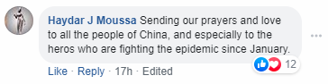 網(wǎng)友Haydar J Moussa評論:“向所有中國人民送上我們的祝福和愛,尤其是那些從一月起就和疫情作斗爭的英雄們!