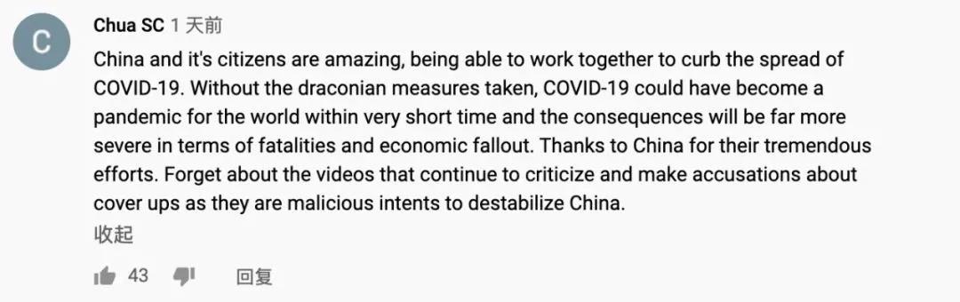 “中國和中國人民真的很棒,能夠團結(jié)起來防控疫情。如果不采取嚴(yán)厲的措施,新冠肺炎可能在很短的時間內(nèi)成為世界性流行病,死亡人數(shù)和經(jīng)濟損失會更加嚴(yán)重!本W(wǎng)友Chua SC稱贊道。