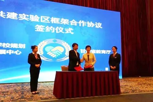 教育部學(xué)校規(guī)劃建設(shè)發(fā)展中心主任陳鋒與甘肅省委教育工委書記、省教育廳廳長王海燕共同為“甘肅省農(nóng)校對(duì)接精準(zhǔn)扶貧實(shí)驗(yàn)區(qū)”揭牌。教育部學(xué)校規(guī)劃建設(shè)發(fā)展中心與甘肅省教育廳簽署共建實(shí)驗(yàn)區(qū)合作框架協(xié)議、與建行甘肅省分行等企業(yè)簽署農(nóng)校對(duì)接精準(zhǔn)扶貧戰(zhàn)略合作協(xié)議。