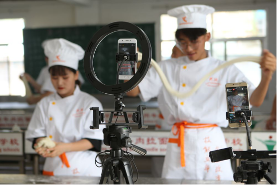 ↑7月10日,在蘭州市興隴蘭州牛肉拉面職業(yè)培訓(xùn)學(xué)校,學(xué)生們練習(xí)拉面技藝,并在網(wǎng)絡(luò)平臺上直播。