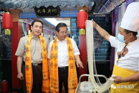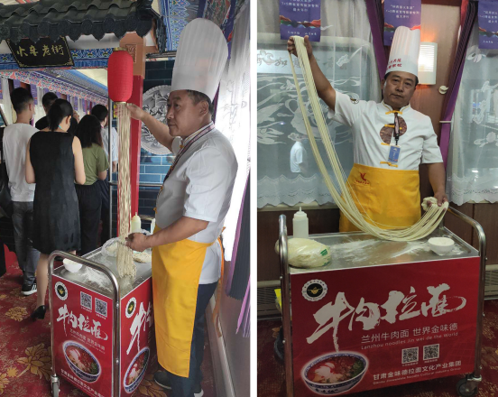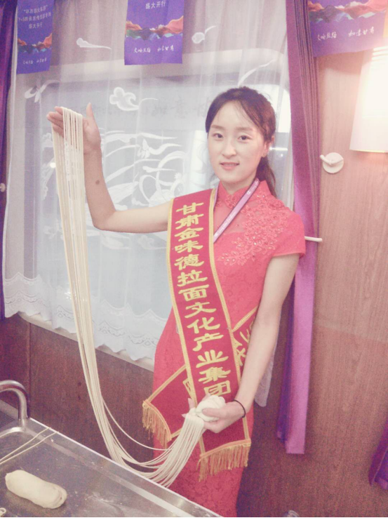 在“環(huán)西部火車游”旅游專列的火車?yán)辖种黝}區(qū),金味德集團的拉面師為參加活動嘉賓展示了精湛嫻熟的拉面技術(shù)。