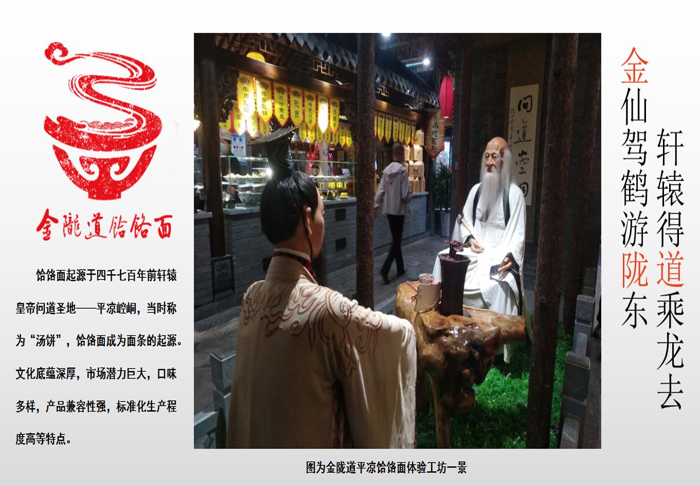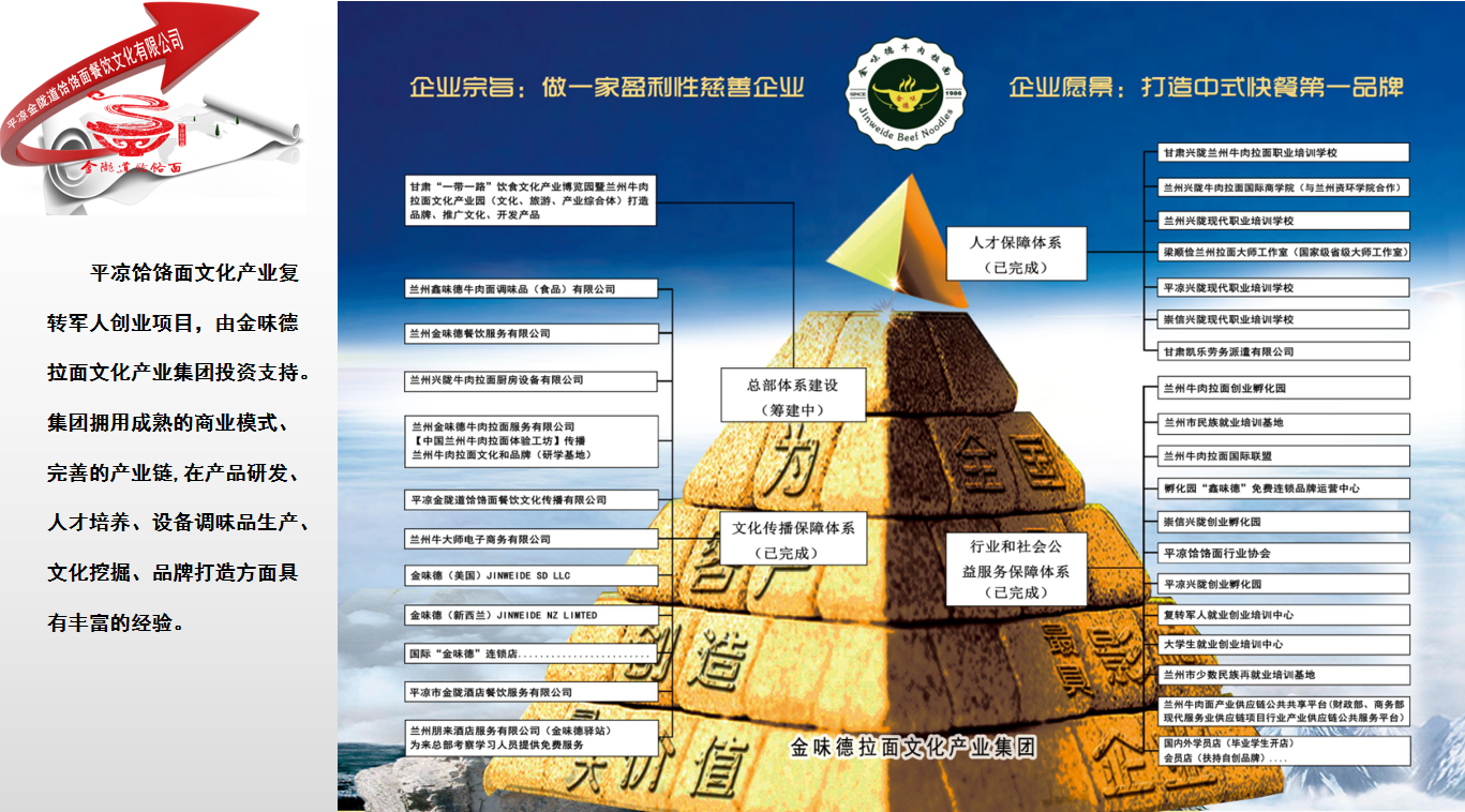 平?jīng)鲳氿浢嫖幕a(chǎn)業(yè)項(xiàng)目是甘肅金味德拉面文化產(chǎn)業(yè)集團(tuán)投資打造的甘肅第二張面條新名片;是以崆峒養(yǎng)生道源文化為載體,以平?jīng)鲳氿浢鏋辇堫^,挖掘宣傳平?jīng)鲳氿浢鏆v史起源文化,結(jié)合多元化養(yǎng)生美食經(jīng)營創(chuàng)新發(fā)展,是集平?jīng)鲳氿浢嫖幕茝V、研學(xué)體驗(yàn)、標(biāo)準(zhǔn)化生產(chǎn)、新產(chǎn)品研發(fā)、技能培訓(xùn)、產(chǎn)業(yè)供應(yīng)鏈信息化共享平臺、平?jīng)鲳氿浢嫫放七B鎖加盟、廚房配套設(shè)備生產(chǎn)研發(fā)、勞務(wù)輸出等功能為一體具有顯著平?jīng)龅赜蛱厣奈幕瘋鞑ス。形成完善平(jīng)鲳氿浢嫖幕⒔ㄔO(shè)饸饹面產(chǎn)業(yè)供應(yīng)鏈,打造“平?jīng)鲳氿浢妗逼放,將平(jīng)鰟?chuàng)建成為《中國饸饹面之鄉(xiāng)》。