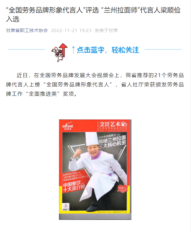 梁順儉先生耕耘蘭州拉面職業(yè)培訓(xùn)14年,累計面向國內(nèi)外培訓(xùn)牛肉拉面人才達(dá)4萬多人。長期致力于蘭州牛肉拉面文化傳播事業(yè),先后于2009年、2010年兩次擔(dān)任蘭州牛肉拉面文化技術(shù)交流大使赴日本交流傳播飲食文化;2011年7月代表全國總工會在廈門參加海峽兩岸職工論壇,2013年在美國華爾街交流蘭州牛肉拉面文化。接待來自全國百強餐飲連鎖企業(yè)代表、財政部、人社部、商務(wù)部等政府、全國行業(yè)協(xié)會考察團。