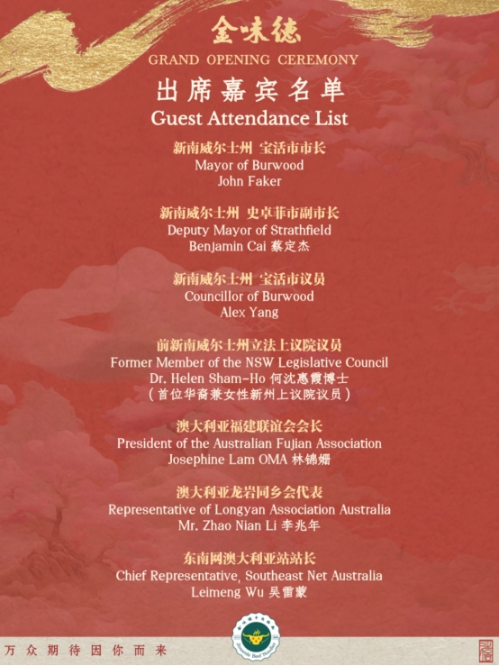開業(yè)當(dāng)天,熱鬧非凡。澳大利亞Burwood市長John、Strathfield(澳大利亞史卓菲市)副市長蔡定杰、市議員AlexYan、澳大利亞首位華人議員何沈慧霞、澳大利亞華人商會代表、福建鄉(xiāng)情聯(lián)誼會會長林錦姍OAM、福建甫田商會會長戴兼凡、澳大利亞餐飲界代表及媒體、金味德拉面文化產(chǎn)業(yè)集團國際部技術(shù)總監(jiān)楊愛國等嘉賓蒞臨現(xiàn)場共同參加了開業(yè)慶典。
